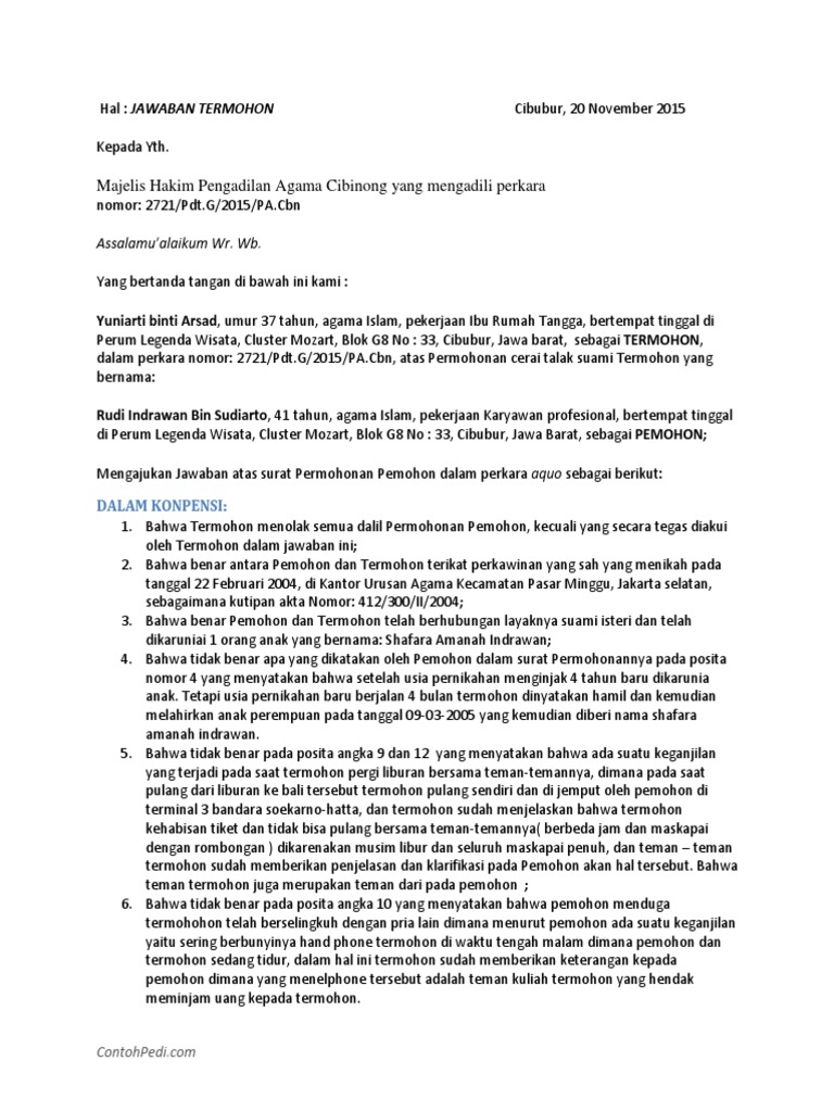 Contoh Eksepsi Dan Jawaban Tergugat Gugatan Perceraian / Contoh Surat Jawaban Gugatan Phi - Download Kumpulan Gambar : Yakni pengadilan negeri yang dalam wilayah hukum dan berwenang.. Eksepsi / jawaban tergugat banda aceh, 17 september 2014. Jawaban dan gugatan rekonpensi perdata. Bahwa turut tergugat i belum bertemu dengan. Surat gugatan adalah suatu surat gugatan perdata yang diajukan oleh penggugat atau kuasa penggugat kepada ketua pengadilan. 123/g.pdt/rcp/ix/2014/pn.mlg antara ima rida 8.