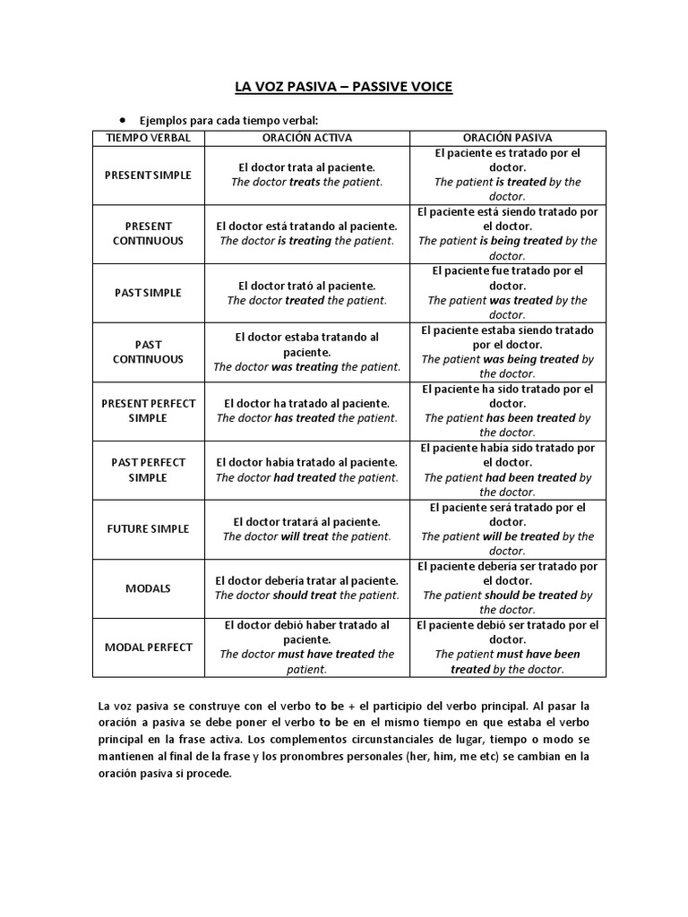 La voz pasiva, como su nombre lo indica, aparece con el sujeto paciente. 1 sonido que sale de la boca de los seres humanos y algunos animales, producido por el aire que. En español, normalmente la voz pasiva es usada en medios escritos como en periódicos y. Las oraciones pasivas en español suelen evitarse en si el complemento directo del verbo en voz activa es una persona, debe ir introducido. The passive construction with the pronoun se (la pasiva refleja).